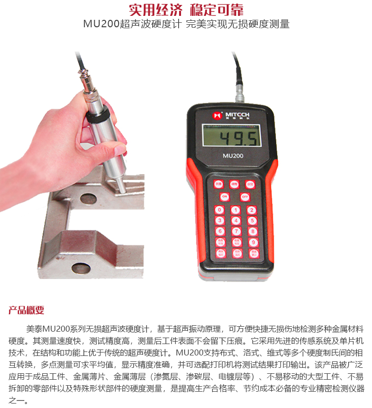 美泰MU200系列無損超聲波硬度計,基于傳感器測桿的超聲振動原理,可方便快捷無損傷地檢測多種金屬材料硬度。其測量速度快,測試精度高,測量后工件表面不會留下壓痕。它采用先進的傳感系統(tǒng)及單片機技術,在結構和功能上優(yōu)于傳統(tǒng)的超聲硬度計。MU200支持布式、洛式、維式等多個硬度制氏間的相互轉換,多點測量可求平均值,顯示精度準確,并可選配打印機將測試結果打印輸出。該產(chǎn)品被廣泛應用于成品工件、金屬薄片、金屬薄層(滲氮層、滲碳層、電鍍層等)、不易移動的大型工件、不易拆卸的零部件以及特殊形狀部件的硬度測量,是提高生產(chǎn)合格率、節(jié)約成本必備的專業(yè)精密檢測儀器之一。