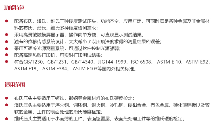 ?符合GB/T230、GB/T231、GB/T4340、JJG144-1999、ISO 6508、 ASTM E 10、 ASTM E92、ASTM E18、 ASTM E384、 ASTM E103等國(guó)內(nèi)外相關(guān)標(biāo)準(zhǔn)。