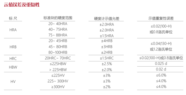 示值誤差:±2.5%(布氏硬度),±0.1HR(洛氏硬度),±2%(維氏硬度)