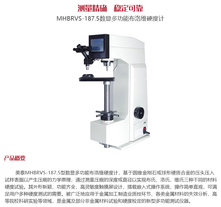 美泰MHBRVS-187.5型數(shù)顯多功能布洛維硬度計(jì),基于圓錐金剛石或球形硬質(zhì)合金的壓頭壓入試樣表面以產(chǎn)生壓痕的力學(xué)原理,通過(guò)測(cè)量壓痕的深度或直徑以實(shí)現(xiàn)布氏、洛氏、維氏三種不同的材料硬度試驗(yàn)。其外形新穎,功能齊全,高靈敏度觸摸屏設(shè)計(jì),搭載嵌入式操作系統(tǒng),操作簡(jiǎn)單直觀,可滿足用戶多種硬度測(cè)試的需要。被廣泛地應(yīng)用于金屬加工制造業(yè)質(zhì)控環(huán)節(jié)、各類金屬材料的失效分析、高等院??蒲袑?shí)驗(yàn)等領(lǐng)域,是金屬及部分非金屬材料研究和硬度檢定的新型多功能測(cè)試儀器。