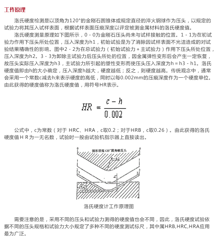 公式中,c為常數(shù)(對(duì)于 HRC、HRA,c取0.2;對(duì)于HRB,c取0.26)。由此獲得的洛氏硬度值HR為一無(wú)名數(shù),試驗(yàn)時(shí)一般由試驗(yàn)機(jī)指示器上直接讀出。