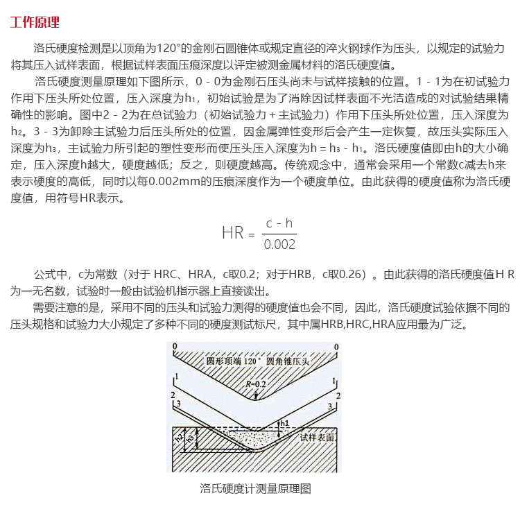 公式中,c為常數(shù)(對于 HRC、HRA,c取0.2;對于HRB,c取0.26)。由此獲得的洛氏硬度值HR為一無名數(shù),試驗(yàn)時一般由試驗(yàn)機(jī)指示器上直接讀出。