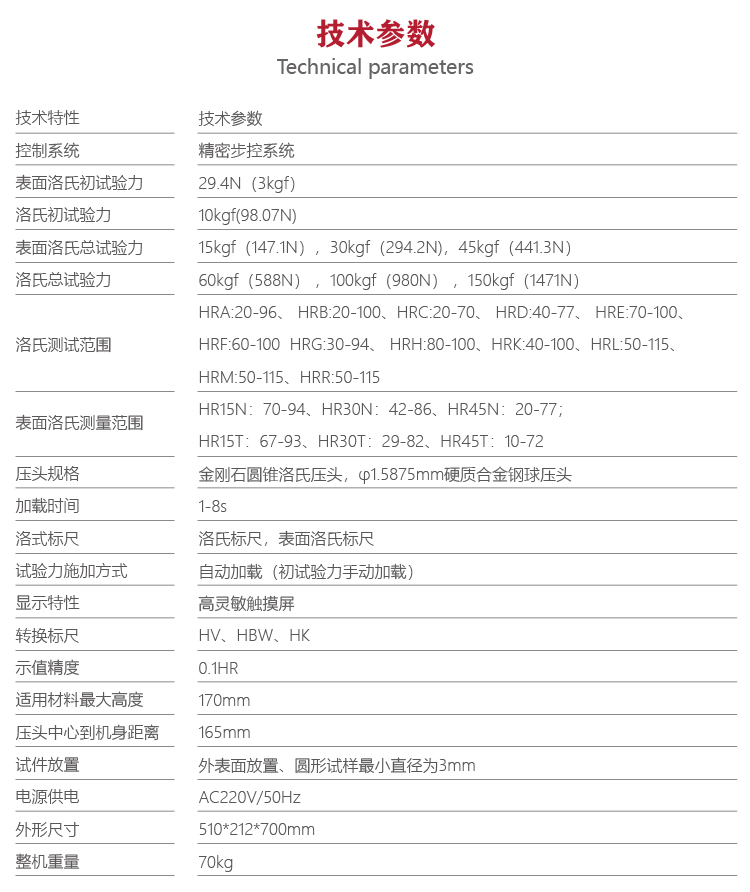 | 表面洛氏測量范圍 | HR15N:70-94、HR30N:42-86、HR45N:20-77;HR15T:67-93、HR30T:29-82、HR45T:10-72 |