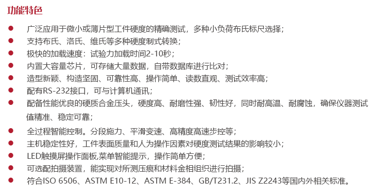 ?符合ISO 6506、ASTM E10-12、ASTM E-384、GB/T231.2、JIS Z2243等國(guó)內(nèi)外相關(guān)標(biāo)準(zhǔn)。