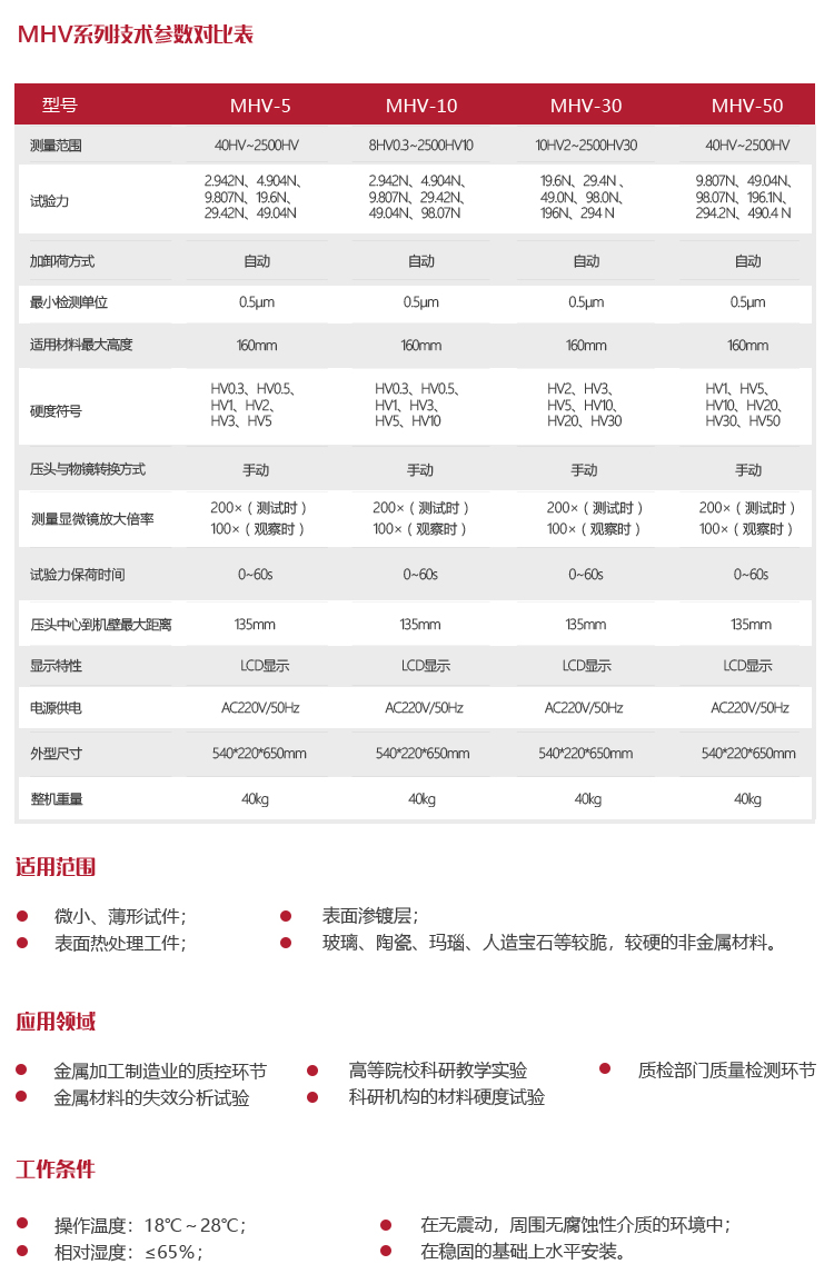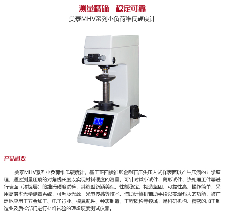 產(chǎn)品概述美泰MHV系列小負(fù)荷維氏硬度計,基于正四棱錐形金剛石壓頭壓入試樣表面以產(chǎn)生壓痕的力學(xué)原理,通過測量壓痕的對角線長度以實現(xiàn)材料硬度的測量,可針對微小試件、薄形試件、熱處理工件等進(jìn)行表面(滲鍍層)的維氏硬度試驗,其造型新穎美觀、性能穩(wěn)定、構(gòu)造堅固、可靠性高、操作簡單,采用高倍率光學(xué)測量系統(tǒng),可調(diào)冷光源,光電傳感等技術(shù),借助計算機(jī)輔助手段以實現(xiàn)強(qiáng)大的功能,被廣泛地應(yīng)用于五金加工、電子行業(yè)、模具配件、鐘表制造、工程質(zhì)檢等領(lǐng)域,是科研機(jī)構(gòu)、精密的加工制造業(yè)及質(zhì)檢部門進(jìn)行材料試驗的理想硬度測試儀器。