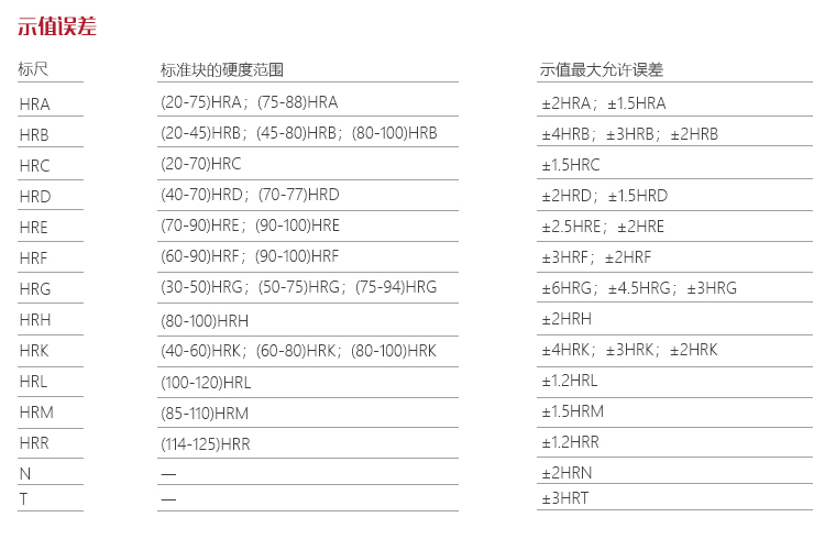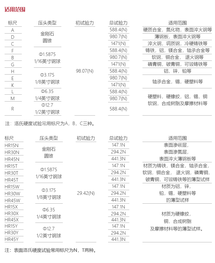 | 洛氏標(biāo)尺 | HRA、HRB、HRC、HRD、HRE、HRF、HRG、HRH、HRK、HRL、HRM、HRP、HRR、HRS、HRV |