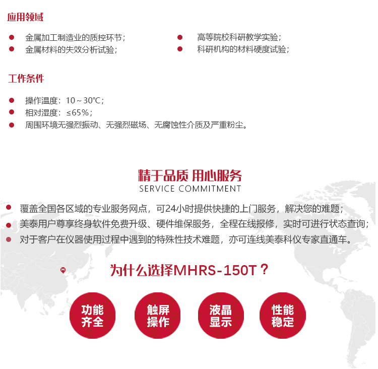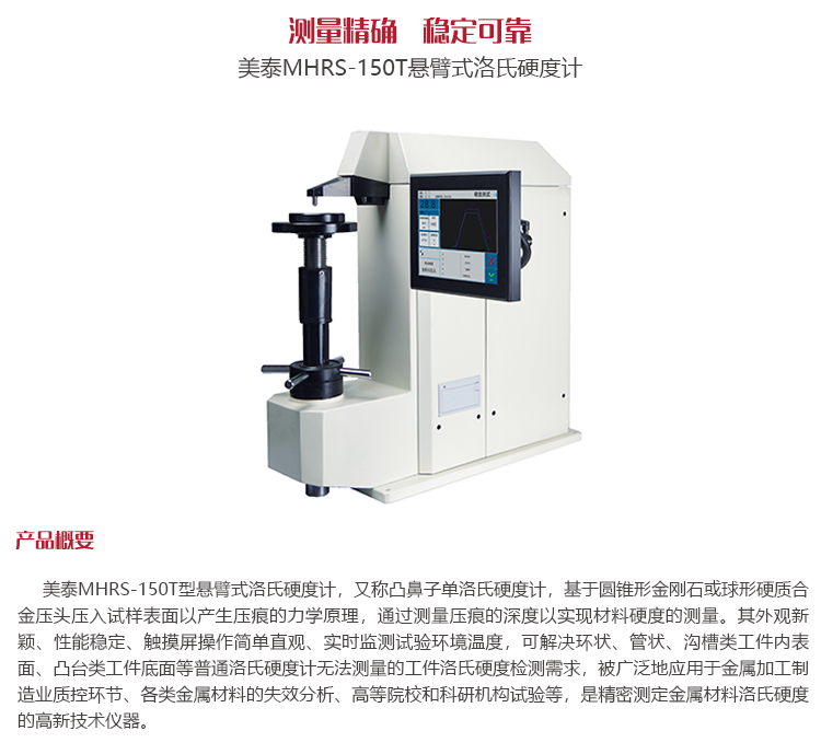 產(chǎn)品概述美泰MHRS-150T型懸臂式洛氏硬度計,又稱凸鼻子單洛氏硬度計,基于圓錐形金剛石或球形硬質(zhì)合金壓頭壓入試樣表面以產(chǎn)生壓痕的力學(xué)原理,通過測量壓痕的深度以實(shí)現(xiàn)材料硬度的測量。其外觀新穎、性能穩(wěn)定、觸摸屏操作簡單直觀、實(shí)時監(jiān)測試驗環(huán)境溫度,可解決環(huán)狀、管狀、溝槽類工件內(nèi)表面、凸臺類工件底面等普通洛氏硬度計無法測量的工件洛氏硬度檢測需求,被廣泛地應(yīng)用于金屬加工制造業(yè)質(zhì)控環(huán)節(jié)、各類金屬材料的失效分析、高等院校和科研機(jī)構(gòu)試驗等,是精密測定金屬材料洛氏硬度的高新技術(shù)儀器。