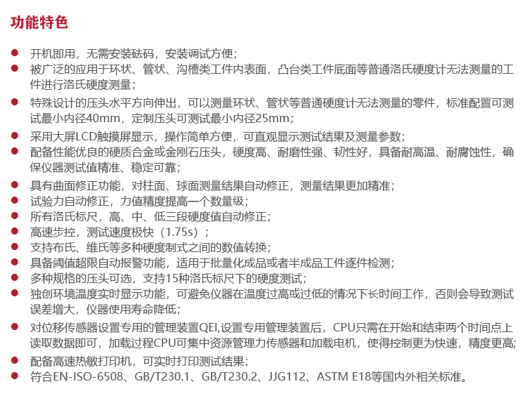 ?符合EN-ISO-6508、GB/T230.1、GB/T230.2、JJG112、ASTM E18等國內(nèi)外相關(guān)標(biāo)準(zhǔn)。