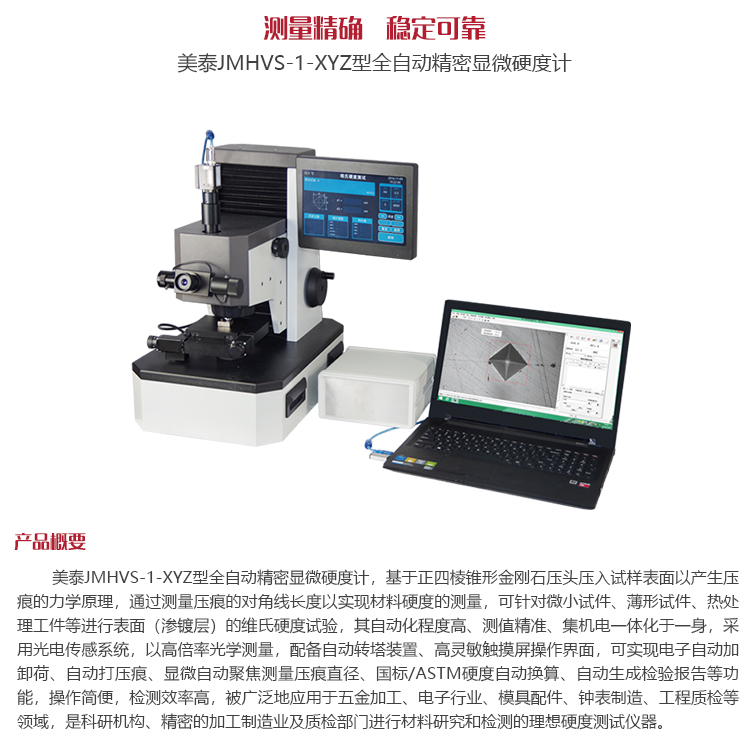 產(chǎn)品概述美泰JMHVS-1-XYZ型全自動(dòng)精密顯微硬度計(jì),基于正四棱錐形金剛石壓頭壓入試樣表面以產(chǎn)生壓痕的力學(xué)原理,通過測量壓痕的對(duì)角線長度以實(shí)現(xiàn)材料硬度的測量,可針對(duì)微小試件、薄形試件、熱處理工件等進(jìn)行表面(滲鍍層)的維氏硬度試驗(yàn),其自動(dòng)化程度高、測值精準(zhǔn)、集機(jī)電一體化于一身,采用光電傳感系統(tǒng),以高倍率光學(xué)測量,配備自動(dòng)轉(zhuǎn)塔裝置、高靈敏觸摸屏操作界面、可實(shí)現(xiàn)電子自動(dòng)加卸荷、自動(dòng)打壓痕、顯微自動(dòng)聚焦測量壓痕直徑、國標(biāo)/ASTM硬度自動(dòng)換算、自動(dòng)生成檢驗(yàn)報(bào)告等功能,操作簡便,檢測效率高,被廣泛地應(yīng)用于五金加工、電子行業(yè)、模具配件、鐘表制造、工程質(zhì)檢等領(lǐng)域,是科研機(jī)構(gòu)、精密的加工制造業(yè)及質(zhì)檢部門進(jìn)行材料研究和檢測的理想硬度測試儀器。