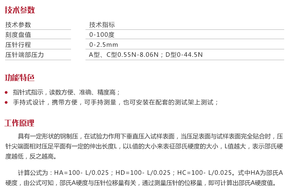 計(jì)算公式為: HA=100- L/0.025;HD=100- L/0.025;HC=100- L/0.025。式中HA為邵氏A硬度.由公式可知,邵氏A硬度與壓針位移量有關(guān).通過(guò)測(cè)量壓針的位移量,即可計(jì)算出邵氏A硬度值。