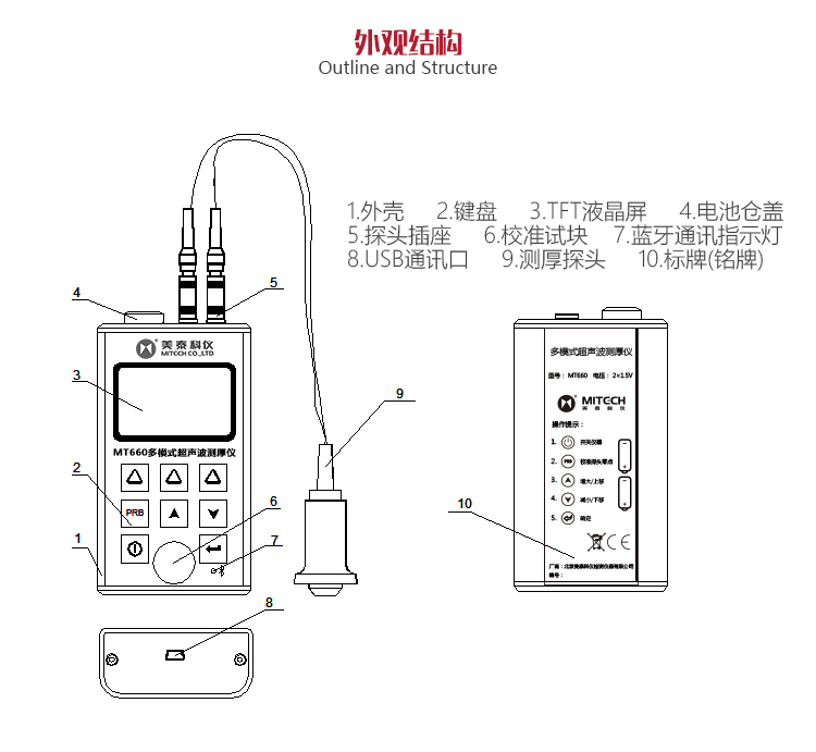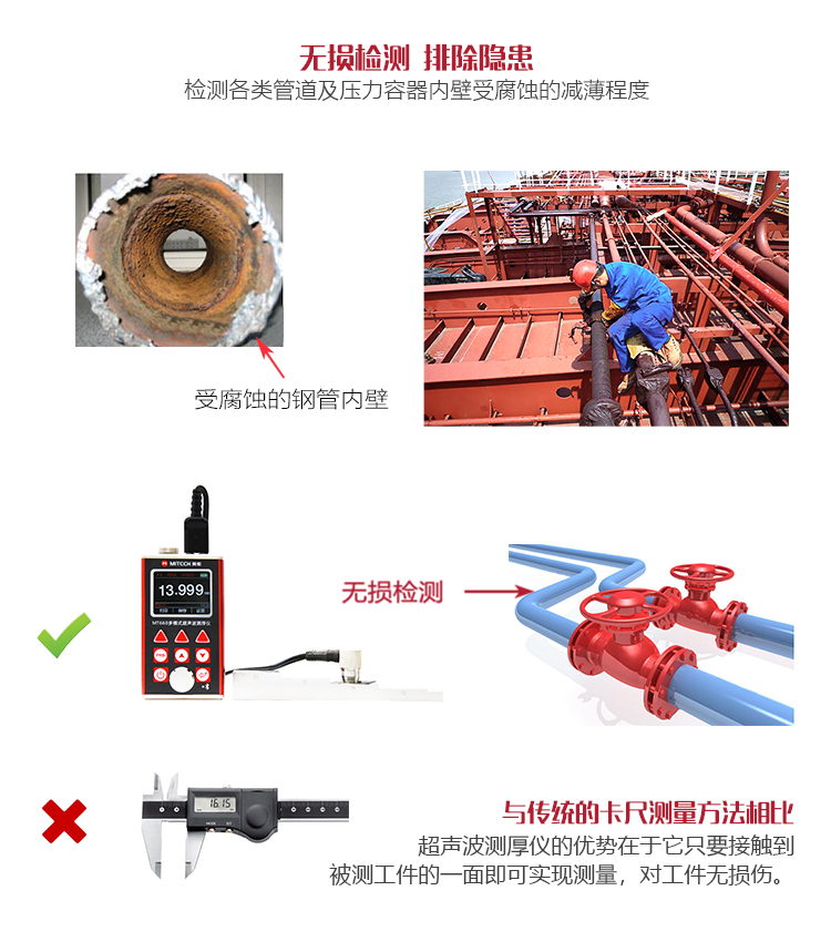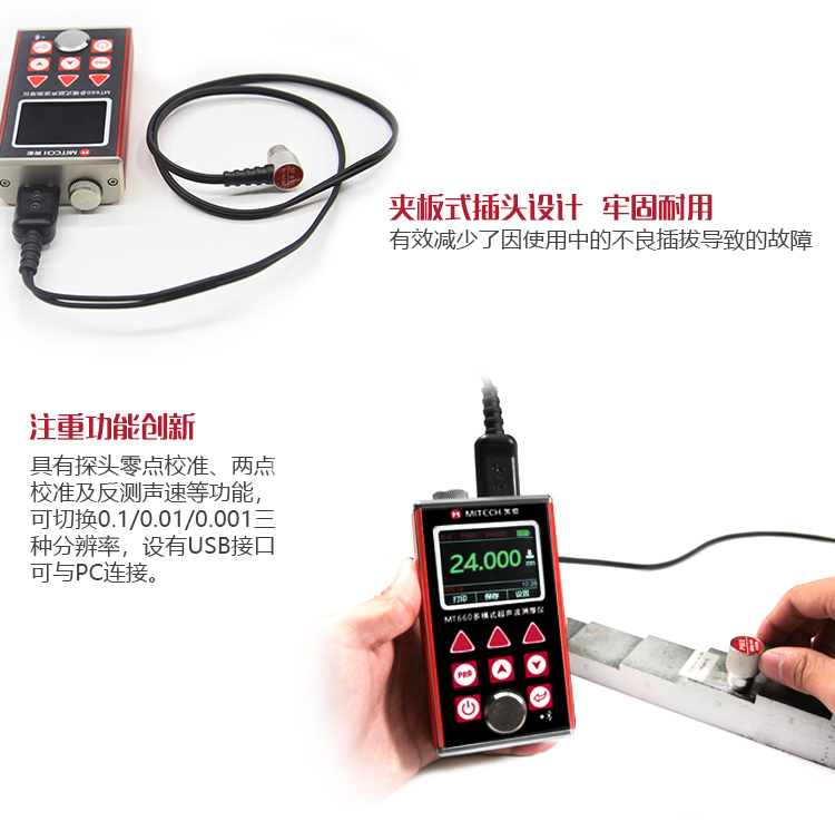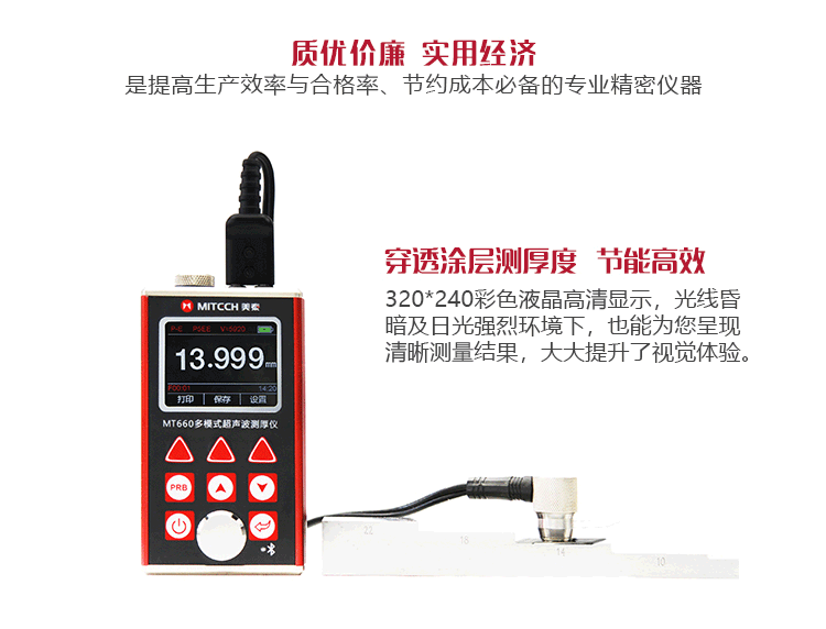 產(chǎn)品概述MT660超聲波測厚儀是美泰公司最新推出的升級(jí)產(chǎn)品,它更加注重用戶體驗(yàn)及功能創(chuàng)新,采用320×240彩色液晶顯示屏,光線昏暗及日光強(qiáng)烈環(huán)境下也能為您呈現(xiàn)清晰測量結(jié)果,大大提升了視覺體驗(yàn),密封的鋁美合金外殼精巧設(shè)計(jì),體積更小、品質(zhì)更優(yōu),專為防御惡劣現(xiàn)場環(huán)境中的油污、粉塵而設(shè)計(jì);智能化警示功能,超出設(shè)定范圍可自動(dòng)提示,可方便讀數(shù),滿足高效采集材料多點(diǎn)厚度的精準(zhǔn)檢測需求,支持0.001高精度顯示、藍(lán)牙通訊,兼?zhèn)浯┩竿繉幽J脚c普通模式雙效功能,其獨(dú)特的可穿透涂層測厚度的性能為表面涂有油漆或防腐材料的工件厚度檢測提供了更加高效的解決方案,測量前無需處理掉表面的涂層,直接亦可測量。被廣泛應(yīng)用于石油、化工、冶金、造船、航空、航天等領(lǐng)域的生產(chǎn)設(shè)備中各種管道及壓力容器腐蝕減薄程度的監(jiān)測,也可用于對各種板材及各種加工零件做精確的測量。是提高生產(chǎn)效率與合格率、節(jié)約成本必備的專業(yè)精密儀器。