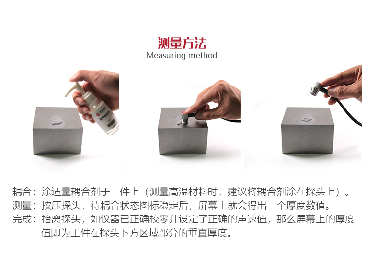 為了使探頭正常工作,必須將探頭表面與待測工件表面之間的空氣去掉,這需要使用耦合劑來完成。這種液體之所以稱為耦合劑是因?yàn)閺奶筋^中發(fā)射的超聲波經(jīng)過該液體進(jìn)入待測工件,其回波又要經(jīng)該液體返回探頭。在測量前,應(yīng)將少量的耦合劑涂在待測工件表面。通常情況,一滴就足夠了涂完耦合劑后,就要將探頭緊密地壓在待測區(qū)域上。耦合狀態(tài)圖標(biāo)穩(wěn)定后,屏幕上就會(huì)得出一個(gè)數(shù)值。如果儀器已正確校零并設(shè)定了正確的聲速值,那么屏幕上的厚度值即為工件在探頭下方區(qū)域部分的垂直厚度。