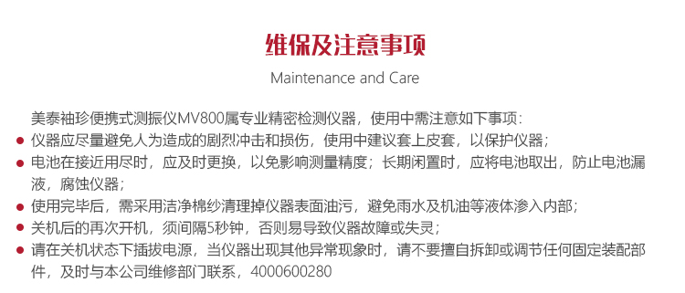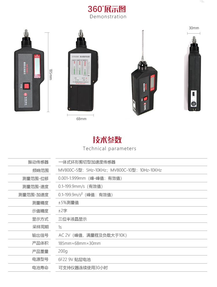 產(chǎn)品概述美泰袖珍一體化測振儀MV800C系列是由壓電式傳感器和數(shù)字顯示電路組成的手持式測振儀表,主要用于測量各種旋轉(zhuǎn)機(jī)械的振動(dòng)加速度、速度和位移。MV800C系列分兩種型號(hào)MV800C-5(頻響范圍:5Hz~10KHz)和MV800C-10(頻響范圍:10Hz~10KH),可滿足常規(guī)測振使用需求以及低頻振動(dòng)測量需求。該產(chǎn)品測量范圍廣,顯示直觀、一體化的設(shè)計(jì)體積小、重量輕,測量攜帶方便,特別適用于野外無電源的現(xiàn)場作業(yè)及高空作業(yè),大大減少工作人員的工作強(qiáng)度,提高工作效率。
