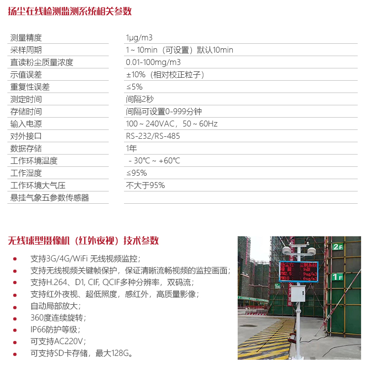 產(chǎn)品概述揚塵在線智能監(jiān)測系統(tǒng)由激光法顆粒物在線監(jiān)測儀、聲級計、視頻拍照系統(tǒng)及氣象設(shè)備等組成,可以通過監(jiān)測顆粒物濃度,實時監(jiān)控揚塵排放情況,并通過聲級計監(jiān)測現(xiàn)場噪聲情況。視頻監(jiān)控系統(tǒng)可完整記錄現(xiàn)場行為,通過設(shè)定顆粒物濃度及噪聲數(shù)據(jù)的報警值,實現(xiàn)報警抓拍,并向系統(tǒng)平臺發(fā)送超標信息。氣象設(shè)備可準確記錄現(xiàn)場的天氣情況。通過集成多種儀器設(shè)備,實現(xiàn)對現(xiàn)場揚塵產(chǎn)生情況的全面監(jiān)控。揚塵在線智能監(jiān)測系統(tǒng)是一款符合GB3096-2008《聲環(huán)境質(zhì)量標準》和GB3095-2012《環(huán)境空氣質(zhì)量標準》,同時支持有線、無線寬帶、3G模式傳輸?shù)母咝阅?、高帶寬、多功能、戶外型專業(yè)級監(jiān)測設(shè)備。
