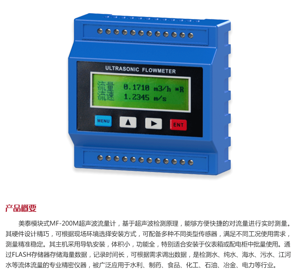 產(chǎn)品概述美泰模塊式MF-200M超聲波流量計(jì),基于超聲波檢測(cè)原理,能夠方便快捷的對(duì)流量進(jìn)行實(shí)時(shí)測(cè)量。其硬件設(shè)計(jì)精巧,可根據(jù)現(xiàn)場(chǎng)環(huán)境選擇安裝方式,可配備多種不同類型傳感器,滿足不同工況使用需求,測(cè)量精準(zhǔn)穩(wěn)定。其主機(jī)采用導(dǎo)軌安裝,體積小,功能全,特別適合安裝于儀表箱或配電柜中批量使用。通過(guò)FLASH存儲(chǔ)器存儲(chǔ)海量數(shù)據(jù),記錄時(shí)間長(zhǎng),可根據(jù)需求調(diào)出數(shù)據(jù),是檢測(cè)水、純水、海水、污水、、江河水等流體流量的專業(yè)精密儀器,被廣泛應(yīng)用于水利、制藥、食品、化工、石油、冶金、電力等行業(yè)。