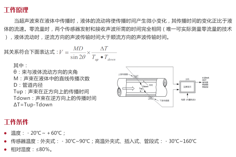 工作原理當(dāng)超聲波束在液體中傳播時(shí),液體的流動(dòng)將使傳播時(shí)間產(chǎn)生微小變化,其傳播時(shí)間的變化正比于液體的流速。零流量時(shí),兩個(gè)傳感器發(fā)射和接收聲波所需的時(shí)間完全相同(唯一可實(shí)際測(cè)量零流量的技術(shù)),液體流動(dòng)時(shí),逆流方向的聲波傳輸時(shí)間大于順流方向的聲波傳輸時(shí)間。