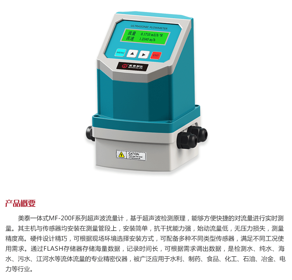 美泰一體式MF-200F系列超聲波流量計(jì),基于超聲波檢測(cè)原理,能夠方便快捷的對(duì)流量進(jìn)行實(shí)時(shí)測(cè)量。其主機(jī)與傳感器均安裝在測(cè)量管段上,安裝簡(jiǎn)單,抗干擾能力強(qiáng),始動(dòng)流量低,無(wú)壓力損失,測(cè)量精度高。硬件設(shè)計(jì)精巧,可根據(jù)現(xiàn)場(chǎng)環(huán)境選擇安裝方式,可配備多種不同類型傳感器,滿足不同工況使用需求。通過(guò)FLASH存儲(chǔ)器存儲(chǔ)海量數(shù)據(jù),記錄時(shí)間長(zhǎng),可根據(jù)需求調(diào)出數(shù)據(jù),是檢測(cè)水、純水、海水、污水、江河水等流體流量的專業(yè)精密儀器,被廣泛應(yīng)用于水利、制藥、食品、化工、石油、冶金、電力等行業(yè)。