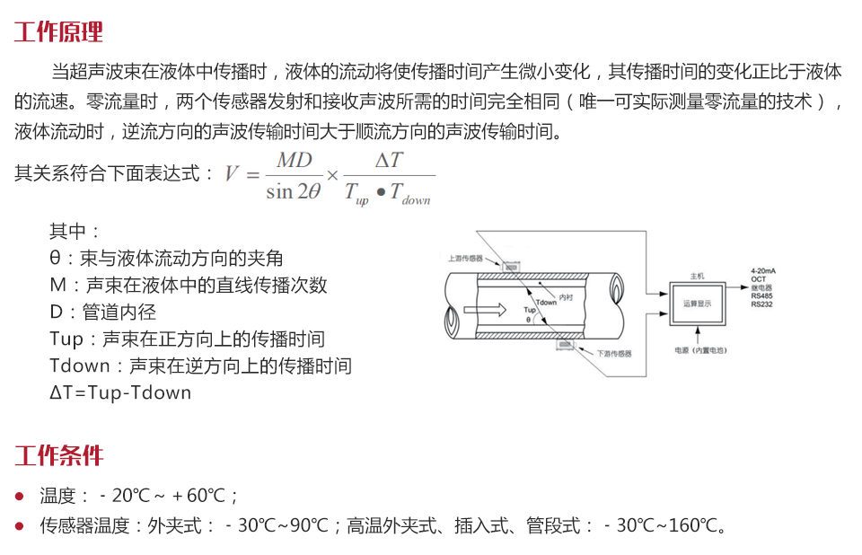 傳感器溫度:外夾式:30℃~90℃;高溫外夾式、插入式、管段式:﹣30℃~160℃。