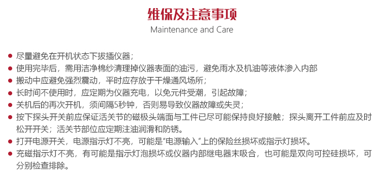?按下探頭開關(guān)前應(yīng)保證活關(guān)節(jié)的磁極頭端面與工件已盡可能保持良好接觸;探頭離開工件前應(yīng)及時(shí)松開開關(guān);活關(guān)節(jié)部位 應(yīng)定期注油潤(rùn)滑和防銹;