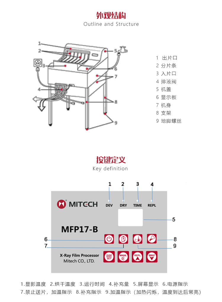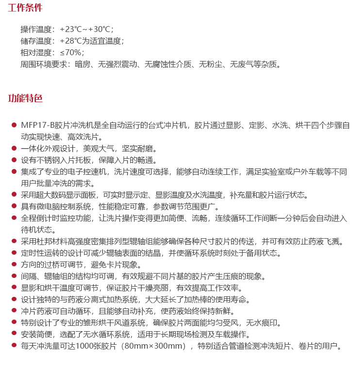 功能用途MFP17-B膠片沖洗機(jī)是全自動運(yùn)行的臺式?jīng)_片機(jī),膠片通過顯影、定影、水洗、烘干四個步驟自動實(shí)現(xiàn)快速、高效洗片。