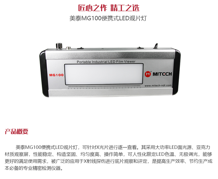 產(chǎn)品概述美泰MG100便攜式LED觀片燈,可針對X光片進行逐一查看。其采用大功率LED面光源、亞克力材質(zhì)觀察屏,性能穩(wěn)定、構造堅固、均勻度高、操作簡單,可人性化限定LED色溫、無極調(diào)光,能夠更好的滿足使用需求,被廣泛的應用于X射線探傷進行底片觀察和評定,是提高生產(chǎn)效率、節(jié)約生產(chǎn)成本必備的專業(yè)精密檢測儀器。