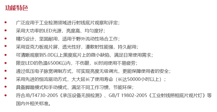 符合JB/T4730-2005《承壓設備無損檢測》、GB/T 19802-2005《工業(yè)射線照相底片觀片燈》等國內(nèi)外相關標準。