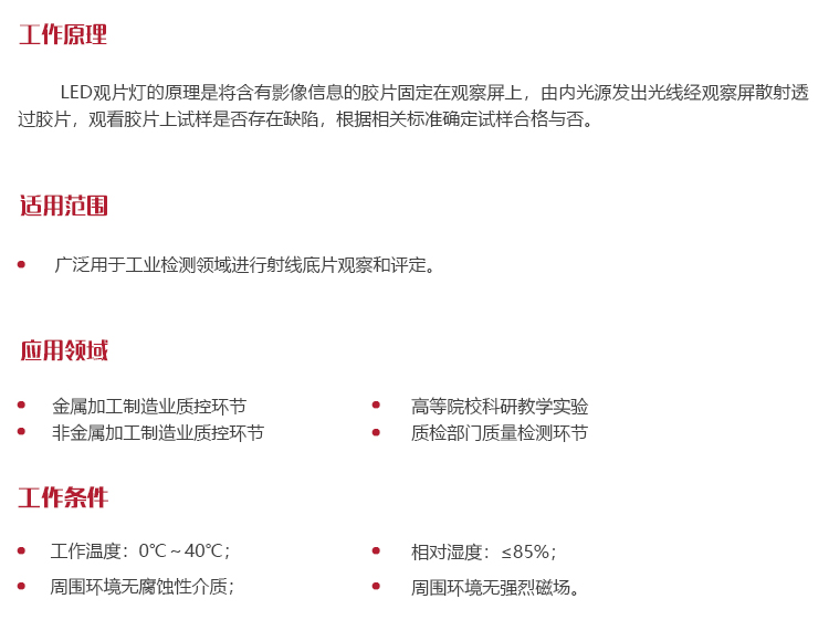 工作原理LED觀片燈的原理是將含有影像信息的膠片固定在觀察屏上,由內(nèi)光源發(fā)出光線經(jīng)觀察屏散射透過膠片,觀看膠片上試樣是否存在缺陷,根據(jù)相關標準確定試樣合格與否。