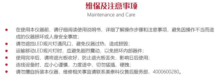 儀器的保養(yǎng)與維護美泰MG100便攜式LED觀片燈屬精密檢測儀器,使用中應特別注意如下事項: