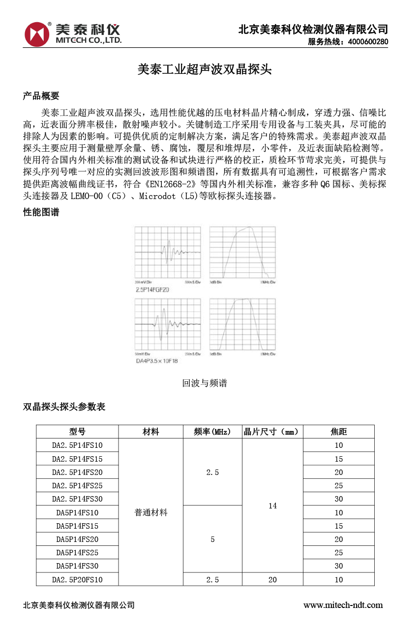 產(chǎn)品概述美泰工業(yè)超聲波雙晶探頭,選用性能優(yōu)越的壓電材料晶片精心制成,穿透力強(qiáng)、信噪比高,近表面分辨率極佳,散射噪聲較小。關(guān)鍵制造工序采用專(zhuān)用設(shè)備與工裝夾具,盡可能的排除人為因素的影響。可提供優(yōu)質(zhì)的定制解決方案,滿(mǎn)足客戶(hù)的特殊需求。美泰超聲波雙晶探頭主要應(yīng)用于測(cè)量壁厚余量、銹、腐蝕,覆層和堆焊層,小零件,及近表面缺陷檢測(cè)等。使用符合國(guó)內(nèi)外相關(guān)標(biāo)準(zhǔn)的測(cè)試設(shè)備和試塊進(jìn)行嚴(yán)格的校正,質(zhì)檢環(huán)節(jié)苛求完美,可提供與探頭序列號(hào)唯一對(duì)應(yīng)的實(shí)測(cè)回波波形圖和頻譜圖,所有數(shù)據(jù)具有可追溯性,可根據(jù)客戶(hù)需求提供距離波幅曲線(xiàn)證書(shū),符合《EN12668-2》等國(guó)內(nèi)外相關(guān)標(biāo)準(zhǔn),兼容多種Q6國(guó)標(biāo)、美標(biāo)探頭連接器及LEMO-00(C5)、Microdot(L5)等歐標(biāo)探頭連接器。