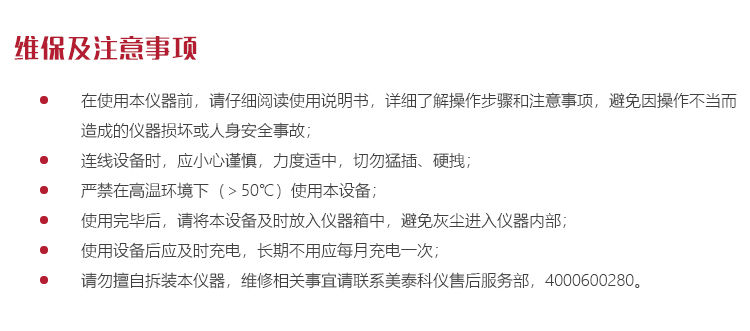 l 請(qǐng)勿擅自拆裝本儀器,維修相關(guān)事宜請(qǐng)聯(lián)系美泰科儀售后服務(wù)部,4000600280。