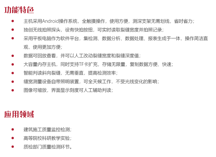 儀器特點(diǎn)l 廣泛應(yīng)用于橋梁、隧道、塔、建筑物、混凝土構(gòu)件、路面、非金屬構(gòu)件表面等裂縫深度檢測(cè);