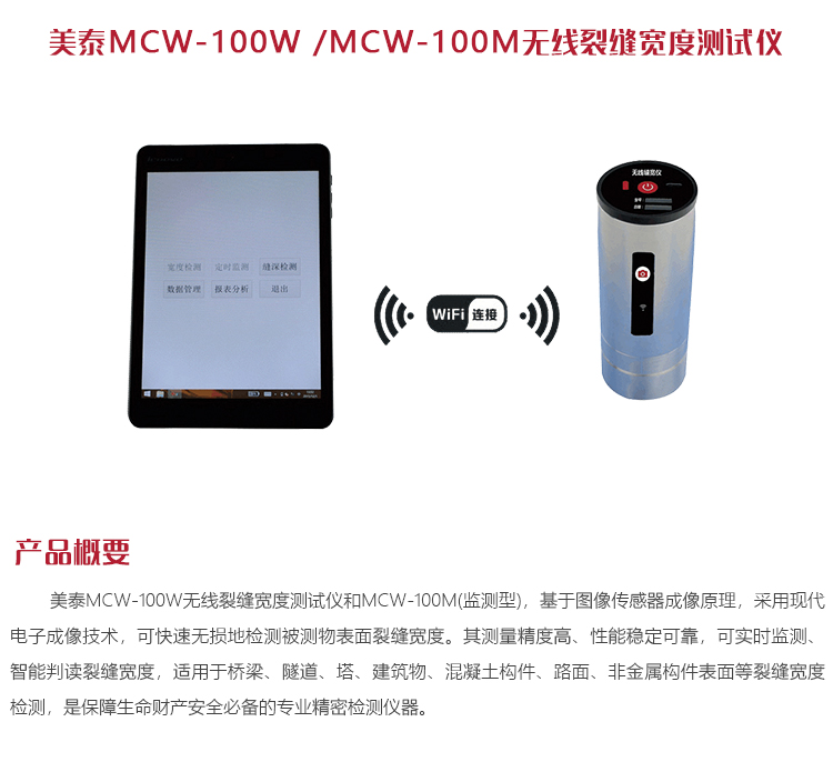 美泰MCW-100W無線裂縫寬度測試儀MCW-100M(監(jiān)測型),基于圖像傳感器成像原理,采用現(xiàn)代電子成像技術,可快速無損地檢測被測物表面裂縫寬度。其測量精度高、性能穩(wěn)定可靠,可實時監(jiān)測、智能判讀裂縫寬度,適用于橋梁、隧道、塔、建筑物、混凝土構件、路面、非金屬構件表面等裂縫寬度檢測,是保障生命財產(chǎn)安全必備的專業(yè)精密檢測儀器。